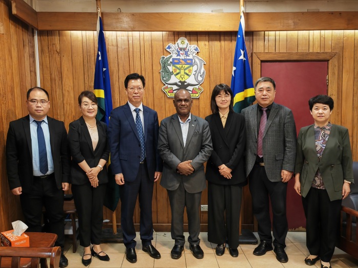 11月6日上午,所罗门群岛总理杰里迈亚·马内莱在位于首都霍尼亚拉的总理府会见我院代表团一行,并与院党委书记王克华举行亲切会谈。